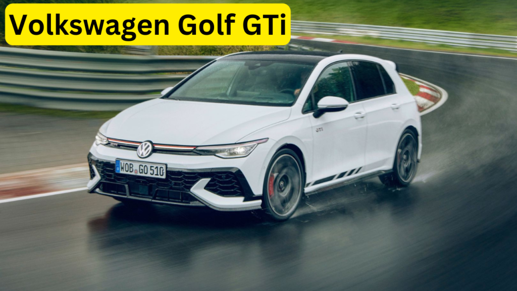 The Volkswagen Golf GTi is an iconic hot hatch with a sporty design, including the signature red grille stripe and GTi badging. The interior features premium materials, a digital dashboard, and advanced infotainment.